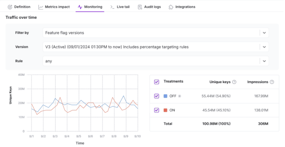 If a time range is selected that spans across versions, vertical lines indicate when a new feature flag version was created. Additionally, a table displays a summary of unique keys and total impressions per treatment.