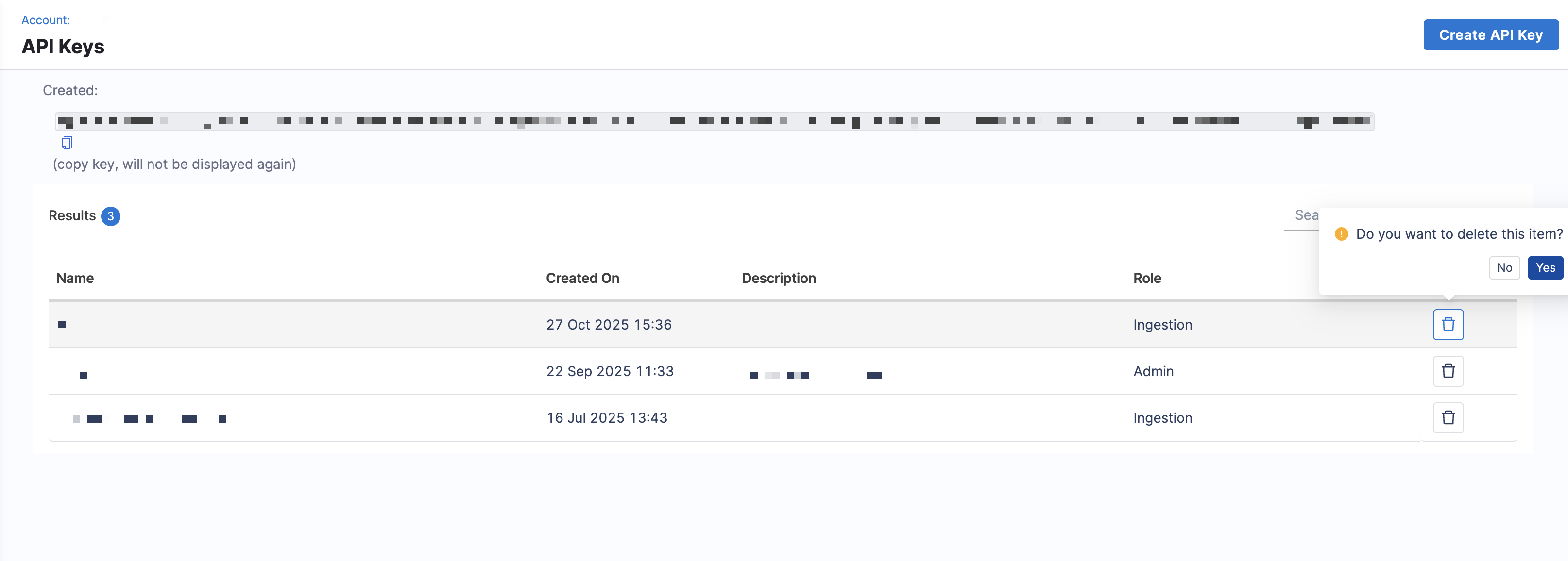 Click the Delete icon next to the key you want to remove. Once deleted, the key is invalidated and cannot be recovered.